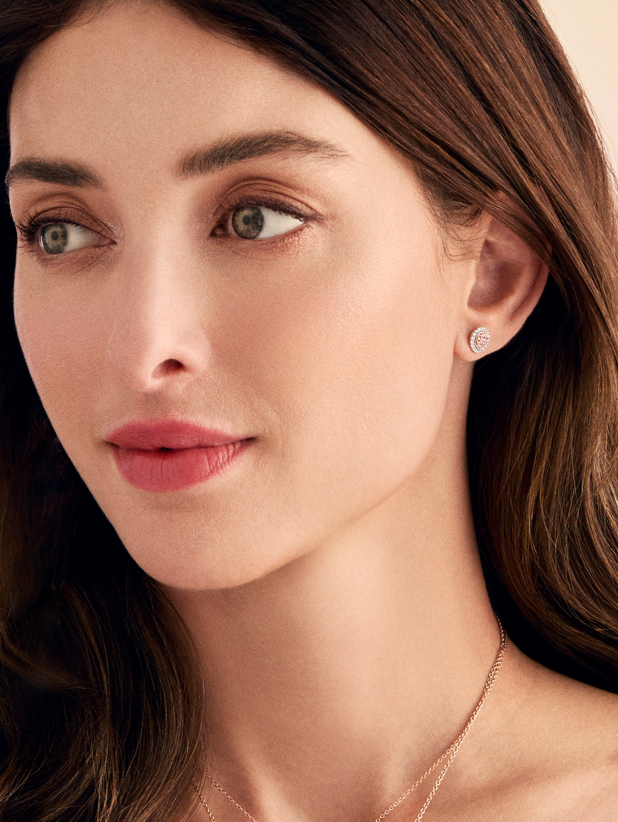 Our best selling Argyle Pink™ Diamond Double Halo Diamond Studs by J FINE with 0.30ct Round 8P/PP-9P/PP Argyle Pink™ Diamonds and 0.23ct Round White Diamonds. Platinum and 18K Pink Gold.