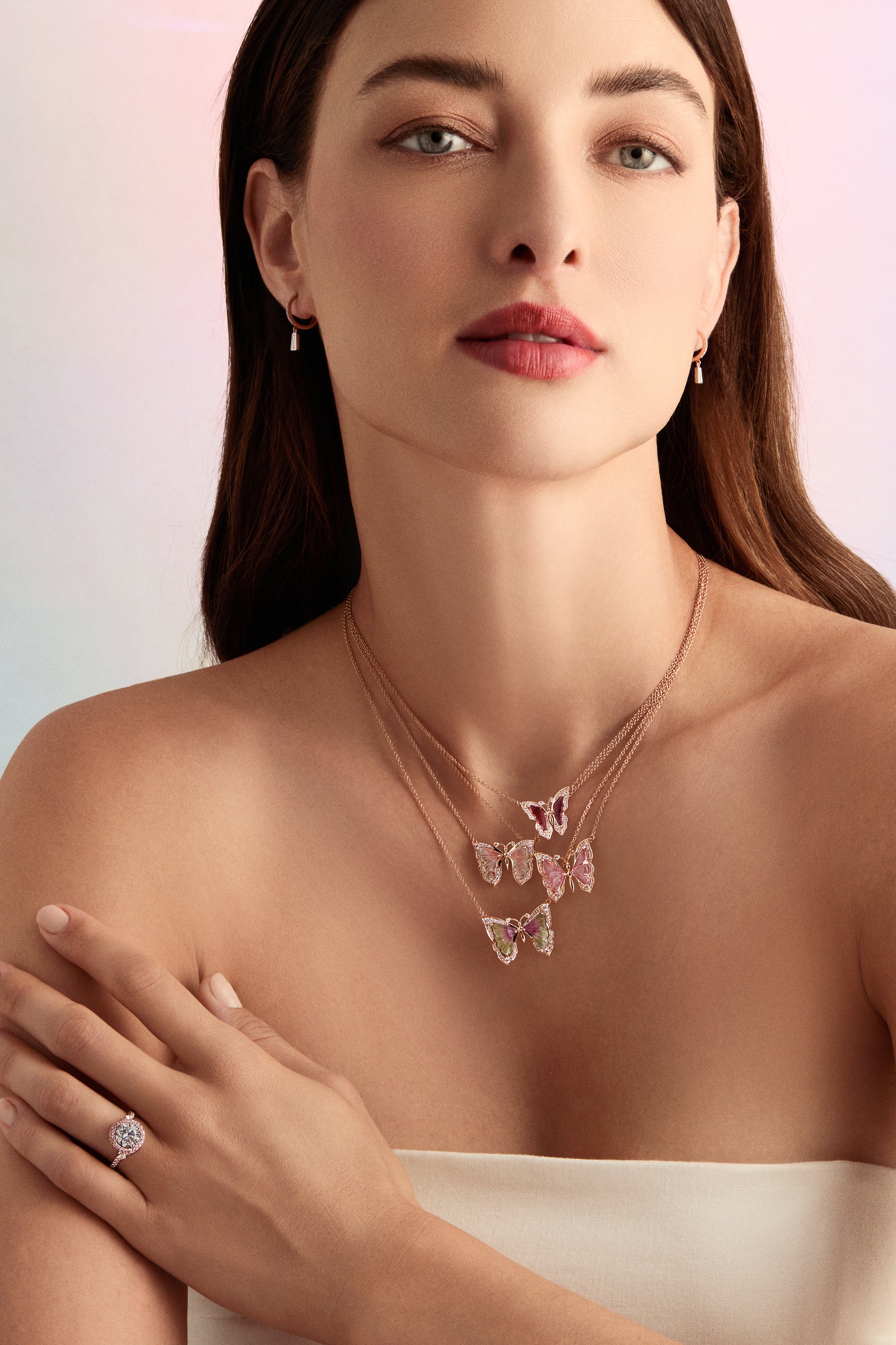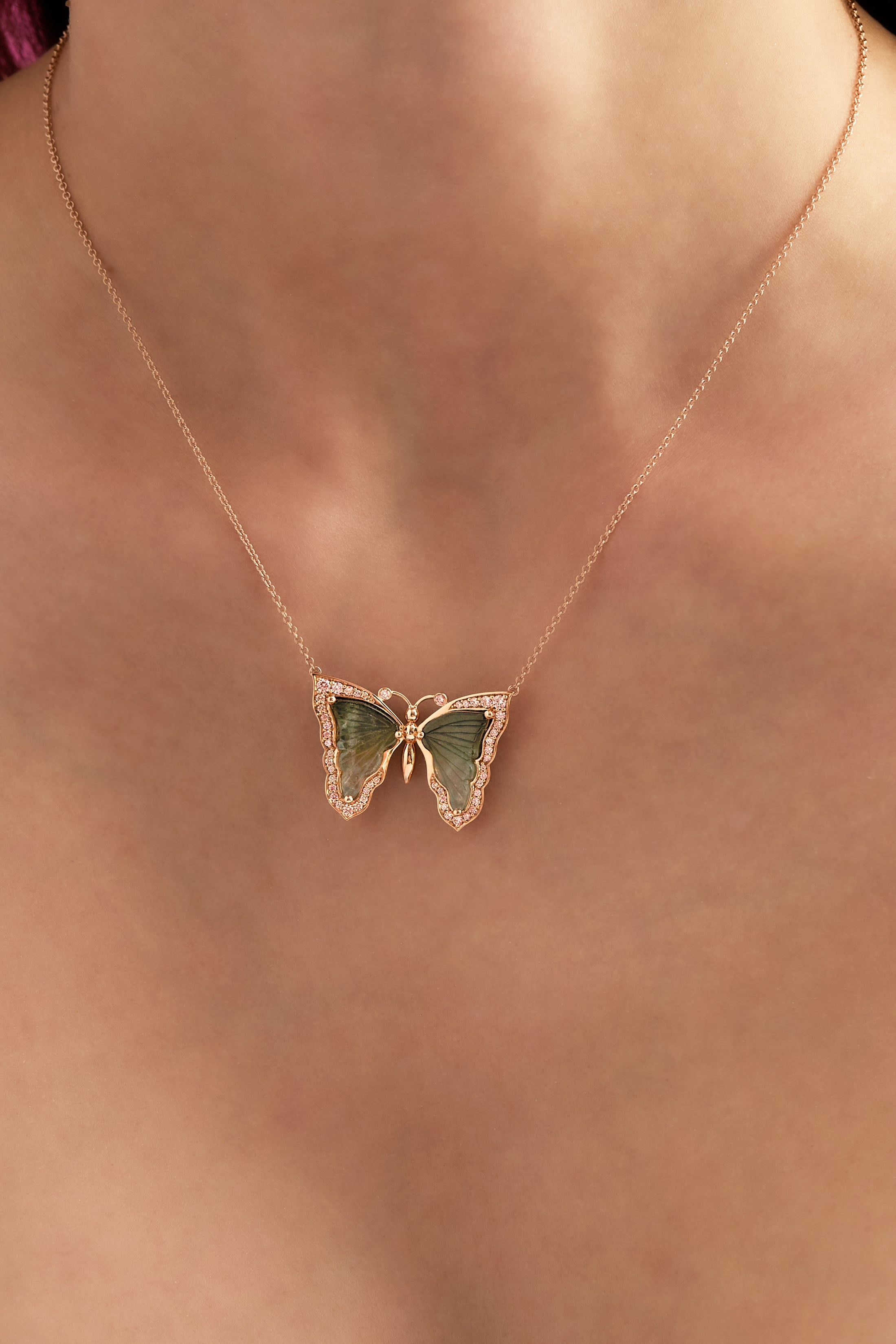 Argyle Pink™ Diamond and Bi Color Tourmaline Butterfly Necklace J FINE with 5.88ct Bi Color Tourmaline and 0.40ct Round 8P/9P Argyle Pink™ Diamonds. 18K Pink Gold on 18" Chain.