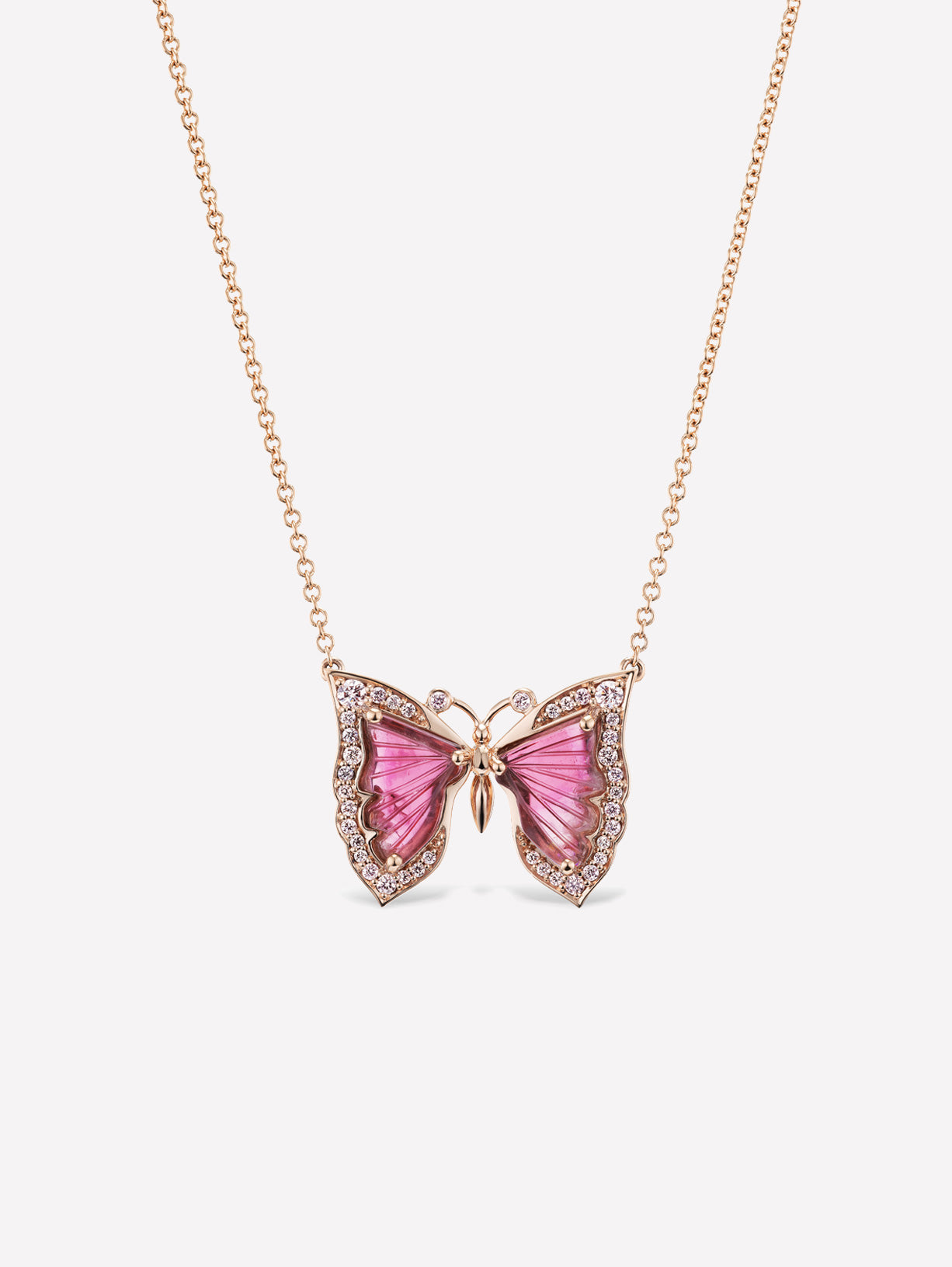 Argyle Pink™ Diamond and Pink Tourmaline Butterfly Necklace by J FINE with 3.40ct Pink Tourmaline and 0.21ct Round 8P/9P Argyle Pink™ Diamonds. 18K Pink Gold on 18" Chain.